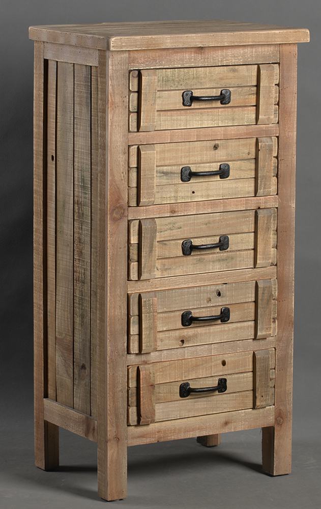 Un estilo rústico maravilloso para tu dormitorio. Atrévete con la originalidad gracias a este sifonier de 5 cajones BALI. Su diseño recrea la construcción en base a listones de madera, originando una armonía perfecta en su apariencia. El toque de los tiradores con forma de asa, que recuerdan al de una maleta de un viajante, pone un aire envejecido irressitible. En los 5 cajones de este sifonier BALI podrás guardar ttoda tu ropa interior y camisetas pequeñas, por lo que te ayudará a liberar el espacio de tu armario. Y además, lo harás con mucho gusto en la decoración de tu habitación.