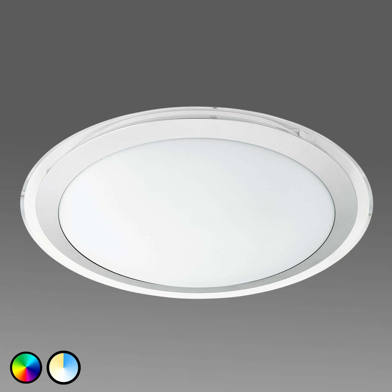 Plafón LED Competa Connect de diseño circular, controlable vía app En cuanto a iluminación se refiere, el plafón LED Competa Connect de diseño circular ofrece una flexibilidad absoluta y su simple forma redonda con difusor satinado y con un decorativo anillo metálico en color plata le permiten integrarse en casi cualquier estilo de mobiliario. Este plafón LED permite manejarse desde el smartphone o tableta mediante la tecnología Connect Bluetooth». Para ello solo ha de descargarse la aplicación disponible gratuitamente para Android e IOS. Y es que con esta aplicación podrá efectuar los más variados ajustes de iluminación desde su propio smartphone e incluso desde fuera de casa. Las opciones de iluminación le permiten: – seleccionar el color luminoso blanco en el espectro comprendido entre los 2700 y los 6500 K – elegir la iluminación de color de entre más de 16 millones de tonos de color distintos – atenuar la luz de modo gradual con independencia del color luminoso seleccionado – seleccionar secuencias de colores a diferentes velocidades – crear y memorizar sus propios ajustes de iluminación – seleccionar escenarios predeterminados o aquellos memorizados por usted Otra opción de control la ofrece el mando a distancia, el cual encontrará en nuestra gama de accesorios. Este último también le permite efectuar los ajustes de iluminación anteriormente mencionados sin requerir de un smartphone o tableta. Asimismo, el mando a distancia puede integrarse, igualmente, en la aplicación vinculándose a un grupo cualquiera de lámparas (lámparas individuales o habitaciones completas). » Grado de eficiencia energética:A+
