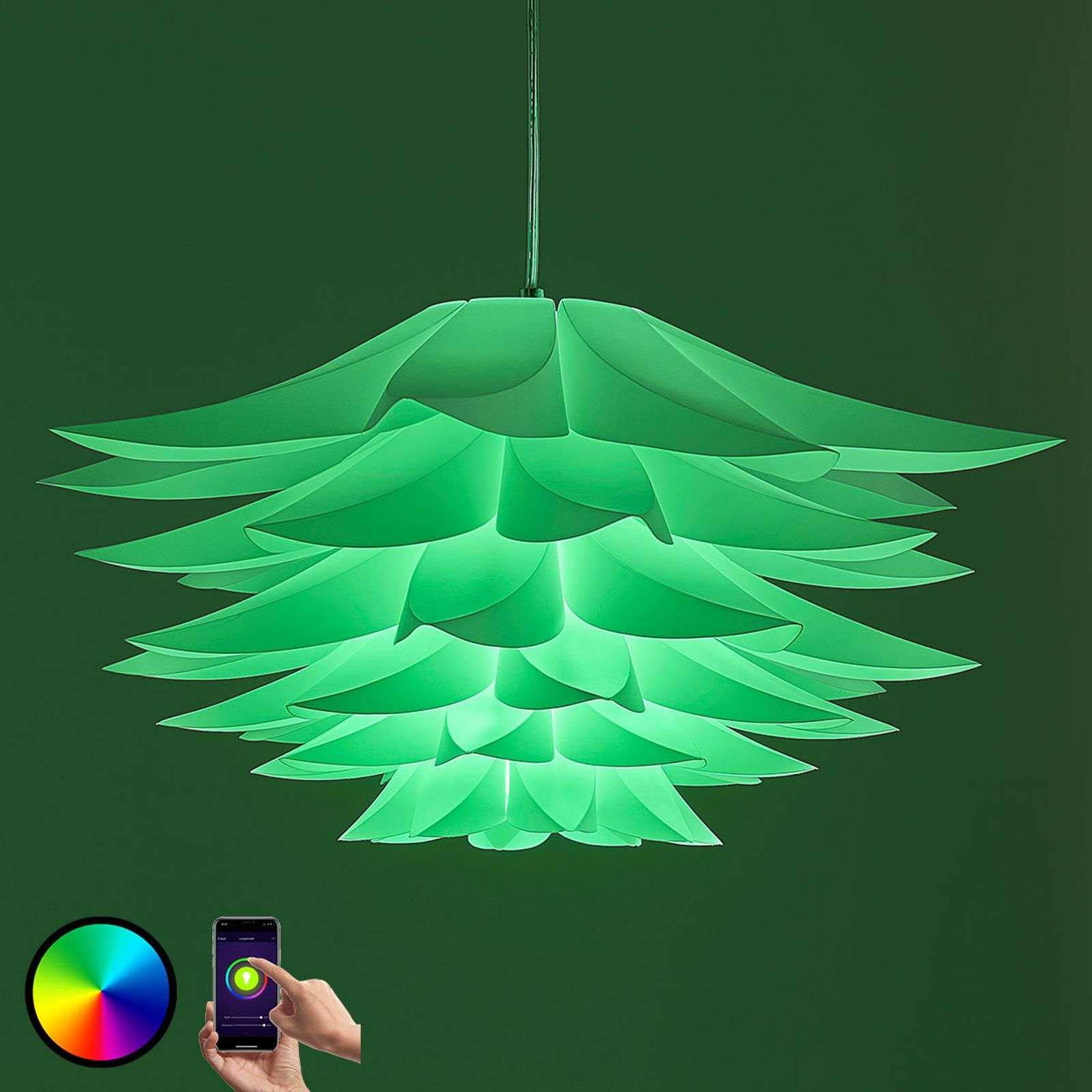 Lámpara colgante LED Lavinja controlable mediante aplicación, con función RGB y tecnología de atenuación integrada La lámpara colgante LED Lavinja se suministra con una bombilla RGB con casquillo E27 que permite el cómodo uso mediante una aplicación (KAFO) basada en la tecnología WiFi, con la que podrá iluminar en colores variados así como atenuarse. Gracias a esta tecnología es posible originar un acogedor ambiente en el salón o, si lo prefiere, brindar una espectacular iluminación en el dormitorio. No obstante, si en la mayoría de momentos de la vida diaria desea sumir su hogar bajo una luz en color blanco cálido, además de la luz multicolor, también podrá hacer realidad esta segunda opción mediante la aplicación y la bombilla. Y en caso necesario, la dinámica luz multicolor puede aportar una iluminación de gran variabilidad. Desde el punto de vista estético, la lámpara colgante LED ofrece un aspecto muy elegante gracias a sus numerosos elementos de plástico blanco en forma flabelada y recuerda ligeramente al estilo escandinavo de hogar. Especialmente si selecciona un discreto color de la luz blanco cálido obtendrá una figura luminosa muy hermosa que le resultará sumamente acogedora e incrementará el nivel de comodidad. – Bombilla compatible con Amazon Echo y con Google Home. Grado de eficiencia energética:A+