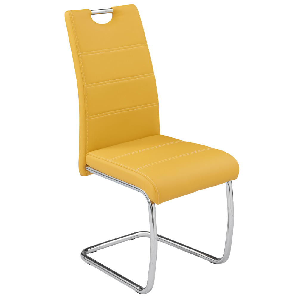 ¿Te atreves a dar un toque de color a tu salón? Con la silla ELEGANCE tendrás lo que buscas si quieres ser osado y arriesgar con tu decoración para que tu casa sea única. El tapizado en piel sintética en uno de sus colores hará que la estancia cobre vida y frescura. Además, el diseño de la silla ELEGANCE también es novedoso. Se sustituyen las tradicionales patas por una escuadra metálica que solo se apoya en la parte delantera. Si quieres ser diferente, haz que la decoración de tu hogar también lo sea.